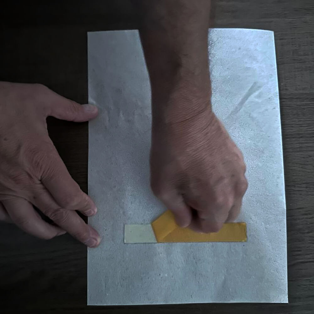 Remova a parte superior da fita dupla face que se encontra no verso do gabarito de instalação.